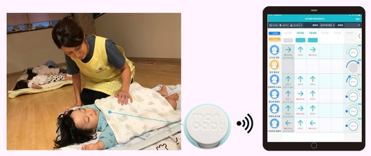 左:園児(0歳児クラス)の衣類にボタン式のセンサーを着用。センサーによる検知と保育士の“目視”のダブルチェックで園児を見守ります。右:体の向きをチェック表に自動記録。うつ伏せ寝や体動静止が続いた場合はすぐにアラートが!