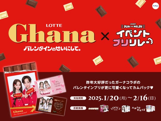 フリュー株式会社(本社:東京都渋谷区、代表取締役社長:三嶋隆、以下 フリュー)と株式会社ロッテ(本社:東京都新宿区、代表取締役社長執行役員:中島英樹、以下 ロッテ)は、チョコレート菓子「ガーナ」とプリントシール(以下、プリ)機のコラボレーションを1月20日(月)~2月16日(日)の期間限定で実施いたします。