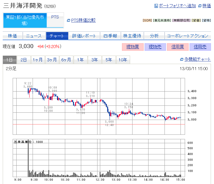 今朝はストップ高で、三井海洋開発来たのかなぁ~と思ったら・・・・・・ 何やら右肩下がりで、あららららら~??? 2411円の頃、お試しに100株だけ仕込むつもりが 間違って1000株仕込んでしまって ちと高騰したので700株は、既に利確済みですが・・・・・ ちと利確が早過ぎた様な感じですね。 300株は、微かな期待を込めてもう少し利確を待ちますかね。