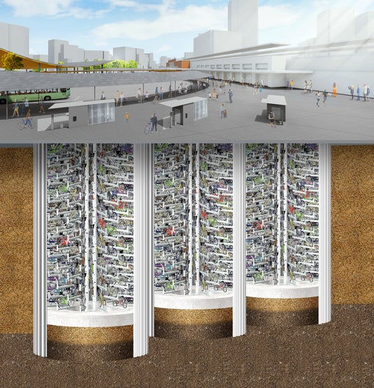 「エコサイクル(TM)」は、子供乗せ自転車をはじめ幅広い車種を1基あたり 200台以上収容できる上、ラッシュ時も混み合うことのない入出庫スピードを実現するなど利便性にも優れています。また「エコサイクル(TM)」の地下躯体は当社の杭圧入引抜機「サイレントパイラー(TM)」で構築するため、既に地中に押し込まれた杭をしっかりとつかむという機械の原理上、転倒の恐れがありません。無振動・無騒音施工、省スペース施工に加え、シンプルな施工工程で早期完工を叶えます。