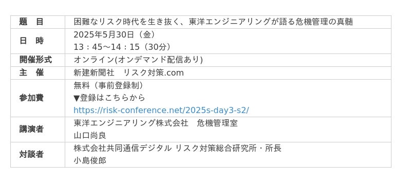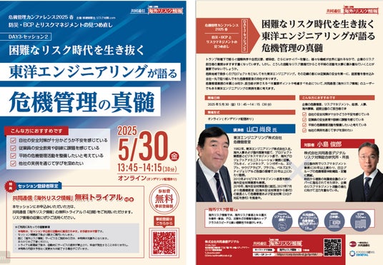 2025年5月30日(金)、当社危機管理室の山口尚良が「危機管理カンファレンス2025春」Day3セッション2にて講演しますのでお知らせします。