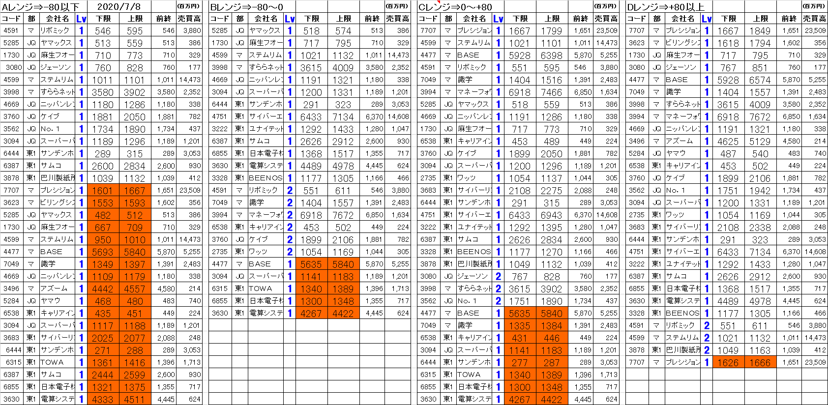 2020/7/8(水曜日) 今日のシステムトレードの仕掛候補一覧です。今日の日経の寄り付きはAレンジでした仕掛表の各レンジは日経平均の前日終値比で以下のよう... ...続きを読む