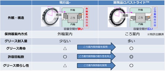 今回の開発品は、新開発の「ころ案内保持器」を採用し、グリース寿命、許容回転数、グリース慣らし性を向上させました。