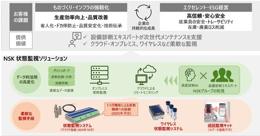 日本精工株式会社(本社:東京都品川区、代表者:取締役 代表執行役社長・CEO 市井 明俊、以下NSK)は、重要インフラで培った診断技術を活用し、高度診断AIおよび経験豊富な当社設備診断エキスパートが支援する「状態監視ソリューション」を拡充し、2024年10月より提供を開始します。
