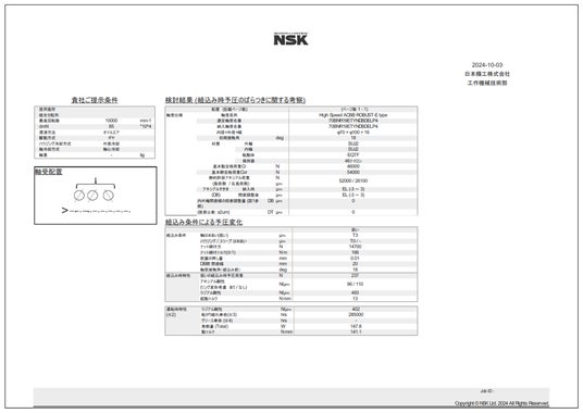 これまで、工作機械主軸用軸受の解析は、お客様からのご依頼に基づき、NSKが解析を実施してきました。本ツールの一般公開により、お客様自身が、軸受の使用環境・条件に合わせて、速やかに解析を実施できるようになります。(例えば、解析結果はPDF形式のレポートとしてメールで送付されるため、簡単に出力いただけます。)その結果、お客様の軸受選定の時間を短縮し、製品開発スピードの向上に貢献します。