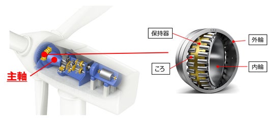 風力発電機主軸用の軸受には、ブレード(羽根)の大きい重量や風による変動荷重を支える役割があり、高負荷容量で調心性*4が高い、自動調心ころ軸受が一般的に使用されます。自動調心ころ軸受が早期損傷する主な原因は、軸受の軌道面の摩耗によるものであり、この摩耗は、過酷な使用環境下で想定以上の重荷重を受けた際に軸受のころと外輪・内輪の間で潤滑機能を果たしている油膜形成が不足するため発生します。市場から求められている高信頼性の実現のためには、軌道面の耐摩耗性の向上が不可欠です。
