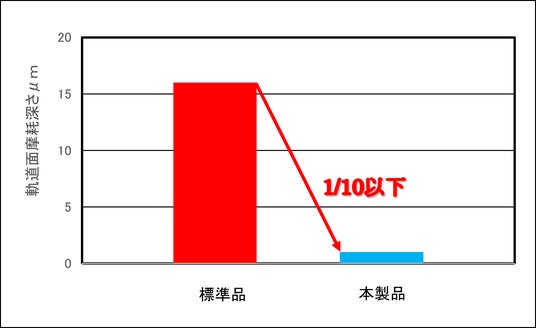 軸受軌道面の摩耗量を、標準品に対して1/10以下に低減。風力発電機主軸用自動調心ころ軸受の主な損傷形態である軌道面の摩耗を低減、軸受の耐久性を大幅に向上させました。