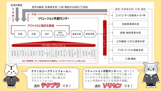 ジェイテクトグループは、製品と製造設備に関する要素技術や知見であるコンピタンスを一堂に集約したテクノロジープラットフォーム(以下「テクプラ」)を活用し、これらのコンピタンスを掛け合わせて社内や社会の困りごとの解決策を提案するソリューション共創センター(以下「ソリセン」)の開設を進めています。