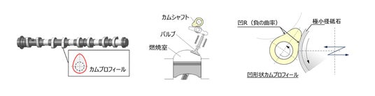 (左から)カムシャフトの概要図、エンジンの燃焼効率を向上させる凹形状カム