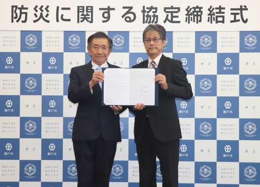 協定書を交わす川本瀬戸市長(左)と手嶋常務取締役