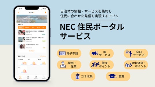 「NEC 住民ポータルサービス」は、自治体が提供する情報・行政サービス・アプリを集約し、住民はNEC 住民ポータルサービスを入口として、各課が提供する様々な行政サービスを利用することが可能になります。