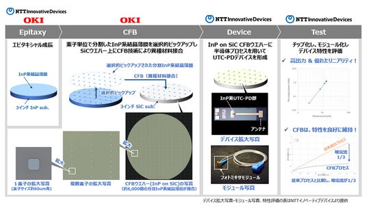 OKIは、NTTイノベーティブデバイス株式会社(本社:神奈川県、代表取締役社長 塚野 英博、以下NTTデバイス)と共同で、CFB(R)(Crystal Film Bonding、(注1))技術を用いて、InP(インジウムリン)系UTC-PD(注2)を放熱性に優れたSiC(シリコンカーバイド)上に異種材料接合することにより、接合歩留まりを向上させ、高出力テラヘルツデバイスの量産技術を確立しました。テラヘルツデバイスは、次世代通信規格である6Gにおける大容量・低遅延通信や、安全性向上に貢献する高精度な非破壊検査などの基盤技術として期待されています。両社は本成果をもとに製品開発を進め、2026年の量産化を目指します。