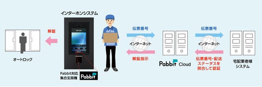 集合住宅用インターホンシステムdearis・PATMOαやオートロック解錠用専用端末Pabbit Liteで、伝票番号や荷物情報を宅配業者様のシステムと照合して認証。荷物が配達中の場合のみオートロックを解錠する仕組みです。