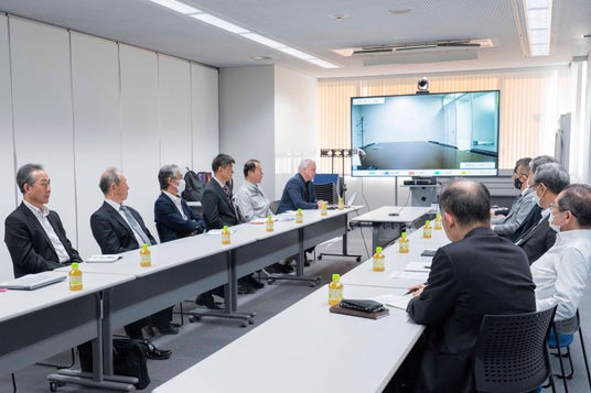 また、5月8日には、アイコム本社でキックオフミーティングが開かれ、社長の中岡や役員らがプロジェクトに参加する社員2人を激励しました。中岡は「当社の無線技術は必ずや防災において大きな役割を担えると信じている。そして変化する市場環境の中、当社だけではできなくても他社との協業などで始めることのできる事業等も必ずある。社員を代表しての研究との自負を持って挑んでほしい」と伝えました。
