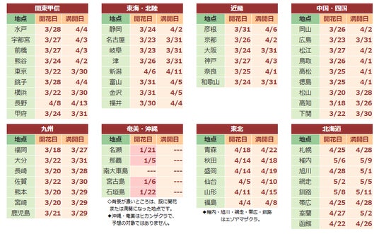 各地の開花・満開予想日