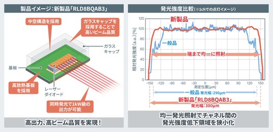 新製品「RLD8BQAB3」の構造図と発光強度比較