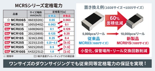 「MCRSシリーズ」は、内部構造の最適化や新材料の採用により、定格電力と温度特性(抵抗温度係数 TCR(*1))を向上させ、従来品に比べワンサイズ小型での使用を可能にしました。1005サイズから6432サイズまでの幅広いラインアップを展開しており、実装スペースに応じた最適な製品を選択できます。これにより、コンパクトかつ効率的な回路設計が可能となり、設計の自由度も大幅に向上します。