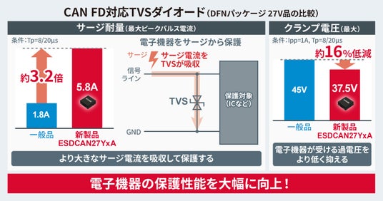 新製品は素子構造の最適化により端子間容量(*3)を最大3.5pFまで低減し、高速通信時における信号劣化を防止。高い耐サージ特性も実現しており、車載環境における電子機器の保護性能を大幅に向上しています。例えばDFN1010パッケージで提供する27V対応品では、CAN FD対応の相当一般品と比較してサージ耐量(*4)が約3.2倍に向上し、クランプ電圧(*5)も約16%低減されています。これにより、車載ECUなどの高価でサージに敏感な電子機器を効果的に保護し、過酷な車載環境でも高い信頼性を提供します。
