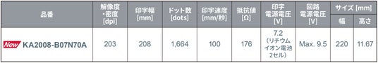 ローム株式会社(本社:京都市)は、リチウムイオン電池2セル駆動(VH=7.2V)に対応した8インチサーマルプリントヘッド「KA2008-B07N70A」を開発しました。