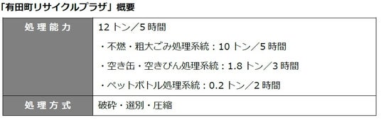 有田町リサイクルプラザは、三菱重工の設計・施工により1999年3月に完成。「不燃・粗大ごみ」、「資源ごみ(空き缶、空きびん、ペットボトル)」を処理・再資源化しており、施設全体の処理能力は5時間当たり12トンです。