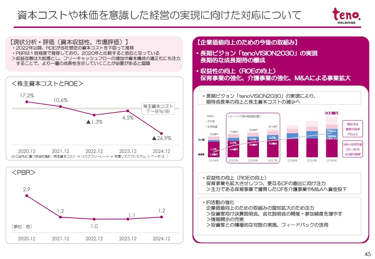 昨年減損したとお話ししましたが、株主資本コストとROEのグラフのとおり、現状のROEは大変低い水準になっています。私たちとしては、やはり「teno VISION 2030」を進めることと、なんと言っても、ROEを着実に向上させていくことが重要だと思っています。