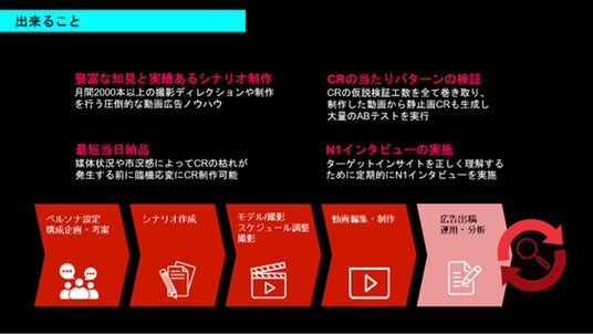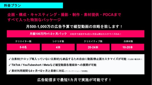 当社においても、これまでに蓄積してきたノウハウを用いて縦型動画広告サービスをすでに開始しております。トレンドの変化が速く、質の高い動画クリエイティブが量産できない、撮影やモデルのキャスティングまで十分に手が回らないなどのお悩みに対し、当社は企画立案から制作はもちろんのこと、広告出稿・運用・分析まで一気通貫のパッケージ販売を行っております。お気軽にお問合せください。