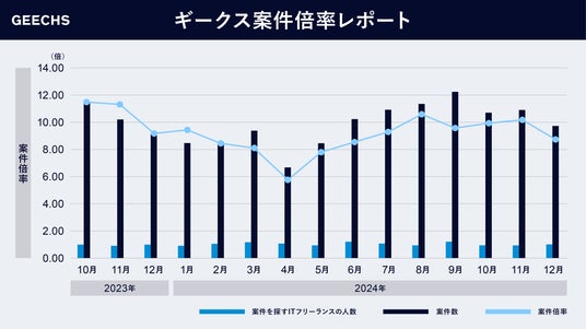 ギークス株式会社(本社:東京都渋谷区、代表取締役CEO:曽根原 稔人、以下ギークス)は、案件数と案件を探すITフリーランスの人数から算出した「案件倍率」をまとめた、「ITフリーランス案件倍率レポート」を発表いたします。このデータは、ITフリーランス市場における需給トレンドを表すもので、ギークスでは、本レポートを四半期に一度発表しており、今回は2024年10~12月の案件倍率をまとめています。