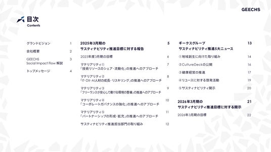 前年度に引き続き、読みやすさと信頼感のあるデザインやトーンにもこだわりました。本レポートを通じて、多くの方に「ギークスらしいサスティナビリティ推進」を感じていただければ幸いです。