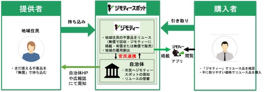 ジモティースポットは、「不要になったけれどもまだ使えるモノ」を地域のコミュニティ内で譲り合うことが出来るサービスです。持ち込み希望の方は、ジモティースポットに持ち込むだけで、手軽に必要とする方へ譲渡することができます。そして、譲り受け希望の方は、持ち込まれたモノの情報を地域の情報サイト「ジモティー」で検索し、ジモティースポットで引き取ることでマッチングが成立する仕組みとなっています。