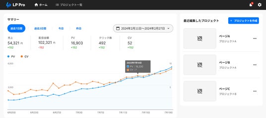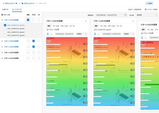 「LP Pro」で制作した各ページの各種KPIを期間指定で網羅的に確認できるほか、ユーザーがどこをクリックし、または離脱したかがシンプルに把握できるヒートマップによって、PDCAを高速に回すことが可能になります。