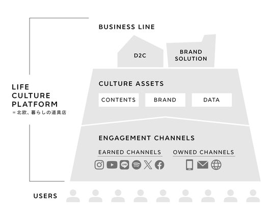 ライフカルチャープラットフォーム構成図。「北欧、暮らしの道具店」は、お客様と個別の商品やコンテンツではなく、世界観(ライフカルチャー)でつながるプラットフォームであり、ブランド力・信頼性・さまざまなデータを蓄積しています。