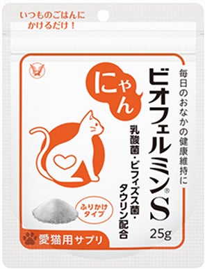 「わんビオフェルミンS」「にゃんビオフェルミンS」は、愛犬・愛猫の腸内フローラを整えるための、生きたまま腸まで届くビフィズス菌とアシドフィルス菌(乳酸菌)を配合したサプリメントです。また、猫用には猫が体内で十分に合成できないタウリンをプラスで配合しています。「いつものご飯にひとふり」、サッとかけていただくだけの手軽なふりかけ(プレーン味)タイプとなっています。国内製造原料を使用し、保存料・合成着色料不使用で安心してお使いいただけます。