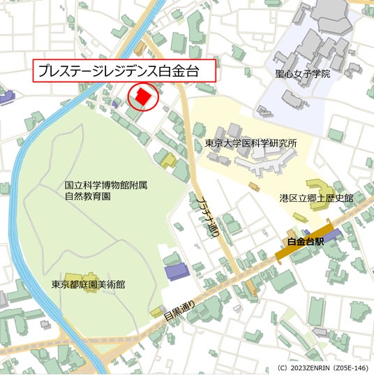 本建物は、東京メトロ南北線・都営三田線の白金台駅出口1より徒歩10分、国立科学博物館附属自然教育園、東京大学医学研究所、聖心女子学院といった緑豊かでアカデミックな文化施設に囲まれた、都内有数の高級邸宅街に位置し、当社が自社開発案件として初めて用地の取得から間取り・仕様の企画を行った高級賃貸マンションです。