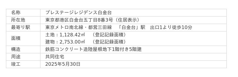 当社は、2023年6月1日付「開発案件用地の取得完了に関するお知らせ」で公表いたしました「白金台5丁目計画」の新築工事を進めてまいりましたが、今般5月30日付にて竣工し、同日付で建物を取得いたしました。併せて、建物名称を「プレステージレジデンス白金台」(以下「本建物」)に決定いたしましたので、お知らせいたします。