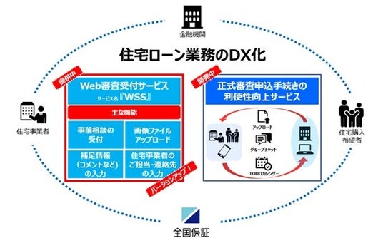 当社(本社:東京都千代田区、代表取締役社長:青木 裕一、以下「全国保証」)は、住宅ローンの保証債務残高拡大のため、金融機関の事務合理化・利便性向上等を目的に提携金融機関とともに「住宅ローン業務のDX化サービス」の向上に取り組んでまいりました。昨年より、金融機関ごとの専用Webサイトより住宅ローン事前相談の受付ができる『全国保証Web審査受付サービス(サービス名称「WSS」)』を提供しておりますが、今般、ご利用金融機関ならびに住宅事業者の皆様のご要望にお応えした機能を追加し、更に利便性が高いサービスとしてご利用いただけるよう、システムバージョンアップを行いましたのでご案内いたします。
