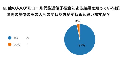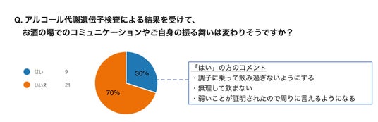 「アルコール代謝遺伝子検査」による結果を受けて、 「お酒の場でのコミュニケーションやご自身の 振る舞いが変わりそう」と30%が回答しました。「弱いことが証明されたので周りに言えるようになる」「無理して飲まない」などのコメントが寄せられ、今後のお酒の場での心構えを育むきっかけの一因となっています。