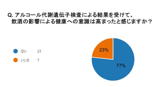 検査を受けた結果、対象者の8割が健康意識が高まったと回答し、3割がお酒の場でのコミュニケーションや振る舞いが変わりそうとして今後の行動変容のきっかけとなりました。「弱いことが証明されたので周りに言えるようになる」などと今後のお酒を飲む際の心構えに関する声が挙がっていました。また、お酒の体質について、2割の人が自分の想定とは違っていたことが分かりました。