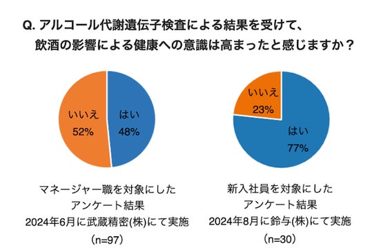 弊社のマネージャー職を対象に実施した調査(2024年6月実施)によると、アルコール代謝遺伝子検査による結果を受けて、 飲酒の影響による健康への意識が高まったと感じた人は48%でした。一方で、今回の調査では77%の新入社員が「意識が高まる」と回答しており、入社して間もないタイミングでの検査の方が、意識醸成にはより効果的である可能性があります。