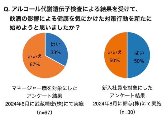 自動車部品の製造・生産に取り組む武蔵精密工業株式会社(愛知県豊橋市)は、当社が開発した「アルコール代謝遺伝子検査キット」を総合物流会社・鈴与株式会社(静岡市清水区)の新入社員を対象に行い、その有用性を検証するために実施したアンケート調査結果を公表します。