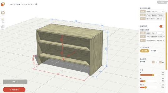 オリジナル家具を3D画面で設計し、そのまま組み立てに必要な木材の注文とカットの依頼まで全てオンラインで行えるオーダーカットサービスです。カット済みの木材は、提携ホームセンターで受け取ることができます。