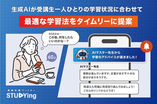 オンライン資格取得講座「STUDYing(スタディング)」を提供するKIYOラーニング株式会社(東京都千代田区、代表取締役社長:綾部貴淑)は、生成AIを活用して、「AIマスター先生」が受講生の個々の学習状況に応じて進め方をタイムリーに提案する「AI学習ナビ機能」を新たにリリースいたしました。