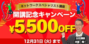 ネットワークスペシャリスト講座の開講を記念して、多くの方にご利用いただけるよう2024年12月4日(水)~12月31日(火)のあいだ「開講記念キャンペーン」を実施いたします。キャンペーン期間中にご購入いただくと、各コース5,500円OFFでご受講いただけます。