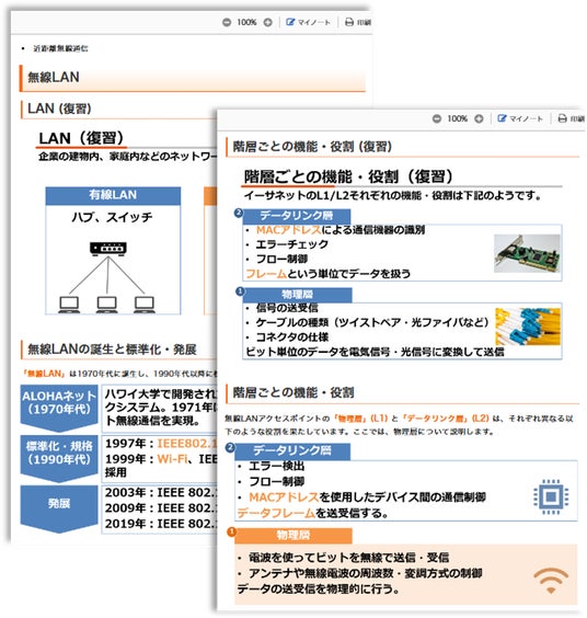 初めてネットワークスペシャリスト試験に挑戦される方でも、視覚的にネットワークの専門用語の内容や関係性を理解しやすいように、テキストや動画講義には、図解での説明を多く採用しました。文章で読んでも分かりにくい専門用語や複雑なロジックも、「図表やイラストを駆使したスライド」を用いて五感を使って学習していただくことで、テレビの情報番組を見るように分かりやすく楽しく学習できます。