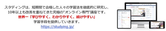 「スタディング」( https://studying.jp/ )は、短期間で合格した人々の学習法を徹底的に研究し、10年以上も改善を重ねてきた究極のオンライン資格取得講座です。