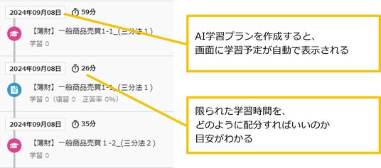 AIが受講者の学習可能時間や現在の実力を分析し、試験日までに最も得点を伸ばせる学習計画を作成します。「今日、何をどこまでやればいいか」が明確に提示されるため、学習の順番やペースに迷うことがありません。また、進捗状況を自動的に記録し、学習プランと実際の学習履歴を比較することで、計画と行動のズレを修正しながら学習を進めることができます。