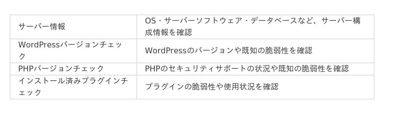 本プラグインは、WordPressで作成したWebサイトの脆弱性となりうる以下の要素を自動的に抽出し、総合的なリスクレベルを5段階で評価します。さらに、AIによる診断結果の要約機能により、専門的な知識がなくてもリスクの内容が理解しやすくなっております。