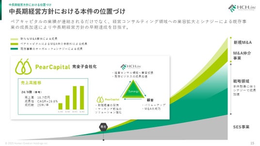 同時に、本件により当社が中長期経営方針で掲げている戦略領域の拡大・業容の変革も推進してまいります。体制強化のため、経営コンサルティング事業準備室に新たな人財を加え、「経営コンサルティング事業戦略室」へと名称を変更いたします。この「経営コンサルティング事業戦略室」とペアキャピタルとが連携をとることで、企業価値協創型のコンサルティング提供を推進していきます。