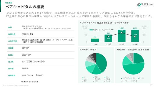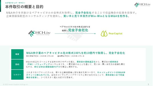 株式会社ヒューマンクリエイションホールディングス(以下、「当社」、その他グループ傘下企業を含めて「当社グループ」という。)は、本日2025年3月14日開催の取締役会において、以下のとおり、株式会社ペアキャピタル(以下、「ペアキャピタル」という。)の全株式を取得し、子会社化することについて決議いたしました。また、ペアキャピタルは、2025 年4月1日付けで商号を変更することといたしましたのでお知らせいたします。