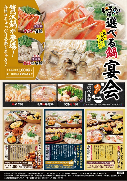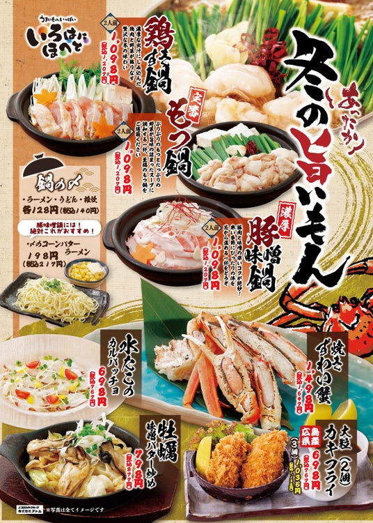 冬の味覚として「大粒カキフライ」を始め、「焼ずわい蟹」などの各種料理や定番あったか鍋をご用意!今年も“いろはにほへと”でどんちゃん騒ぎ!楽しくお過ごし下さい。