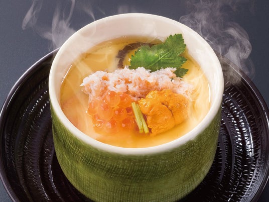 紅ずわい蟹、うに、いくらの三つの贅沢食材を詰め込んだ冬限定の茶碗蒸し。出汁がきいた熱々のあんかけ仕立てです。